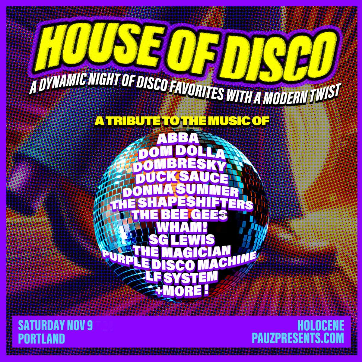 Get ready to groove the night away at HOUSE OF DISCO, the ultimate celebration of classic disco and modern house music anthems! Whether you're a disco diva or a house music head, this event will have everything you need to keep you moving all night long.