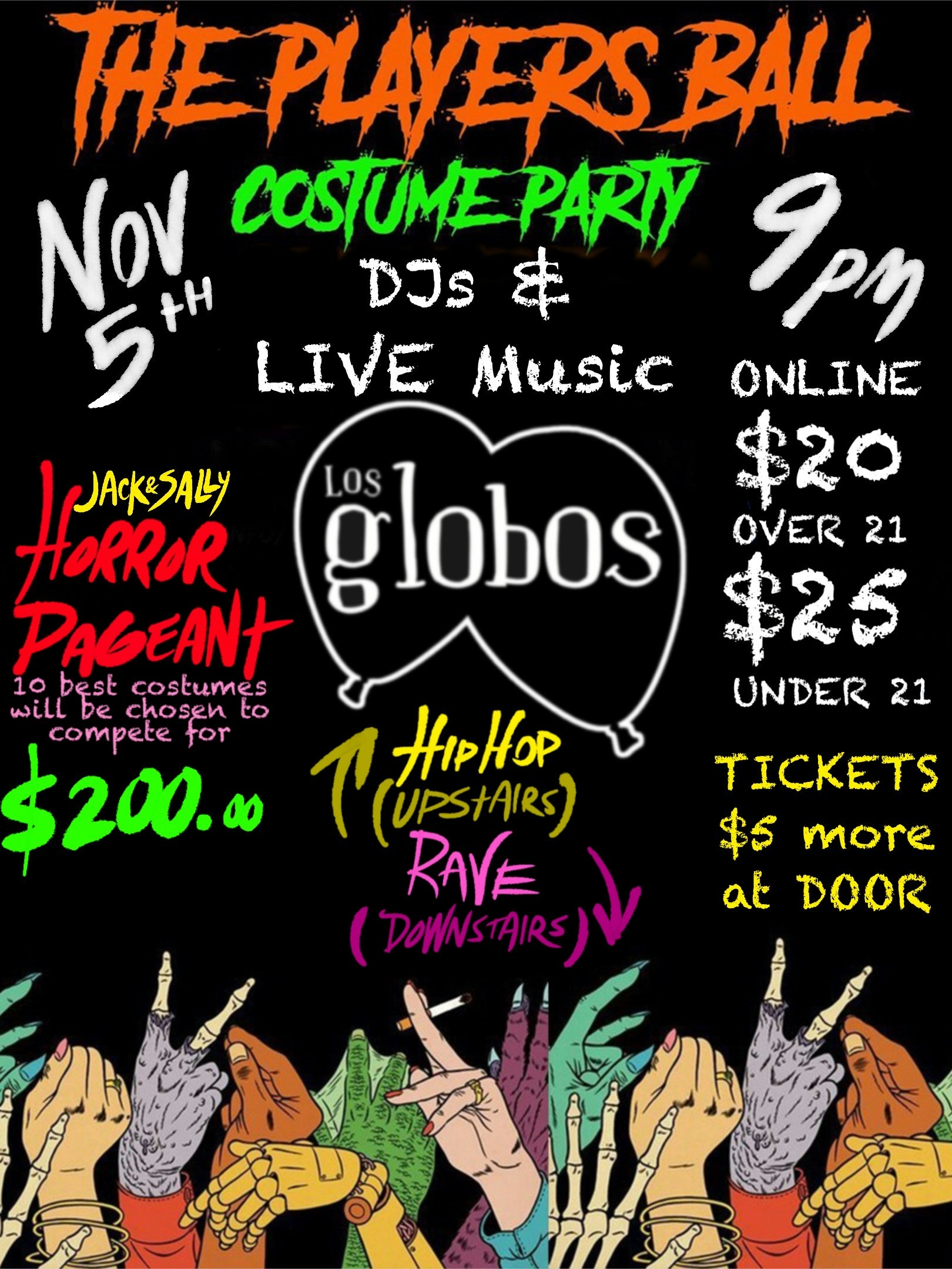 Celebrate the biggest costume party in LA with multiple DJ sets and LIVE music both UPSTAIRS and DOWNSTAIRS at Los Globos! Compete for a chance to win $200 cash at the annual "Jack & Sally HORROR PAGEANT"!