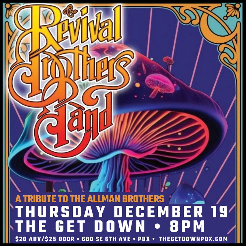 7-piece all-star powerhouse group The Revival Brothers pays reverent tribute to the Allman Brothers and their incredible legacy of iconic music. The band — formed in January 2023 by drummer Jeff Frankel — is based in Portland, Oregon, and in its short existence has won the Cascade Blues Association’s prestigious Muddy Award for Performance of the Year (2023) and is currently playing sold-out shows.