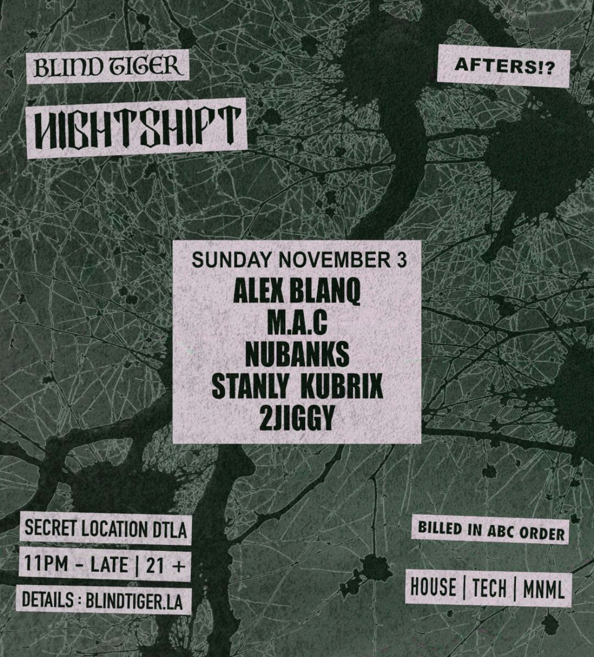 At any of our ‘Nightshift’ events you can expect to hear a strong minimal bass groove, paired with a relentless dark & sexy beat. HOUSE | TECH | MNML ADDRESS SENT WITH PURCHASE CONFIRMATION EMAIL. Presented by Blind Tiger. This is a 21+ event.