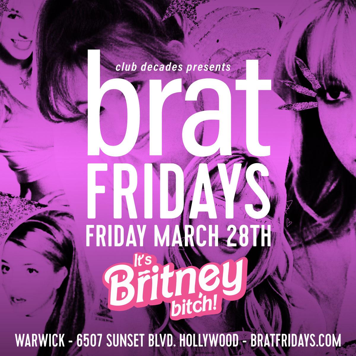 Warwick 6507 West Sunset Boulevard Los Angeles, CA 90028 Brat Friday's It’s Britney B*tch 3/28 @ Warwick Club Decades x Warwick Present BRAT FRIDAYS IT'S BRITNEY BITCH Friday, March 28, 2025 Warwick 6507 Sunset Blvd, Hollywood | 10PM | 21+ Music by: BRITNEY | CHARLI | LANA | SABRINA | COBRAH | OLIVIA | TROYE | TATE | DUA | CONAN | MILEY | BRITNEY | KATY | KELLY | MISSY KYLIE | BEY | KE$HA | AVRIL | CARLY | TAYLOR | GWEN | DOJA | MANDY | MARIAH HILARY | FERGIE | SELENA | JESSICA | CHRISTINA | LIZZO | CARDI | ARIANA + much more Dress Code: SLAY 2 ROOMS | DJ'S | DANCING | BOTTLE & TABLE SERVICE AVAILABLE PRESALE AT WWW.CLUB-DECADES.COM 21+ | Proper ID | Good Vibes Only