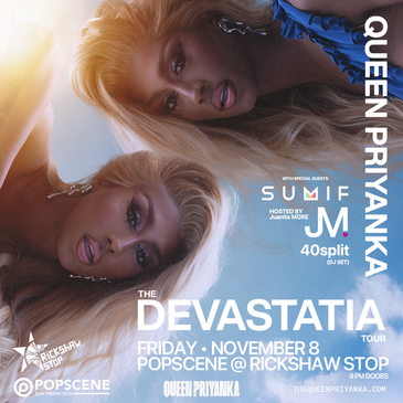 Friday, Nov 8 Popscene + Rickshaw Stop co-present QUEEN PRIYANKA - The Devastatia Tour with SUMif and 40split (DJ set), plus host Juanita MORE! 9 pm doors $25/30 tix all ages
