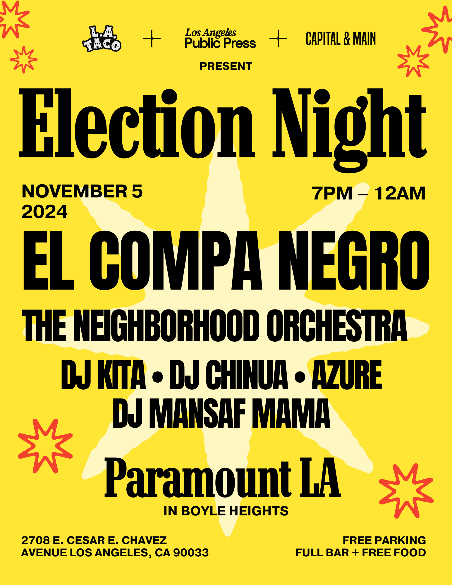 LA Taco + Los Angeles Public Press + Capital & Main Present: Election Night Party w/ The Neighborhood Orchestra + El Compa Negro all ages | 7pm Free with RSVP Presented by LA Taco, LA Public Press, Capital & Main All ages
