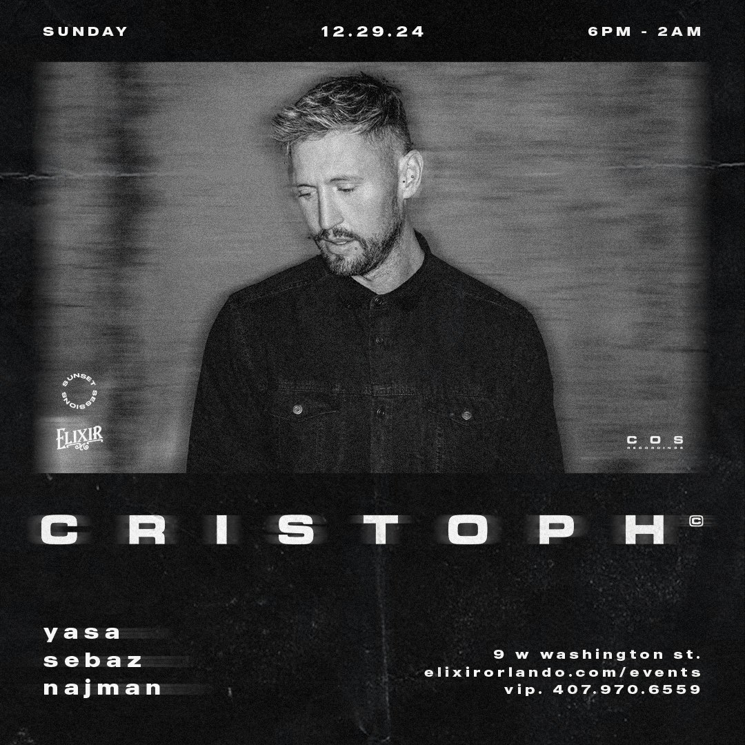 Sunset Sessions at Elixir Orlando showcases house and techno DJs from around the world on an iconic outdoor patio—every Sunday. For this installment, we proudly present progressive powerhouse CRISTOPH \[CRS, Pryda, Anjunadeep\] on December 29th.