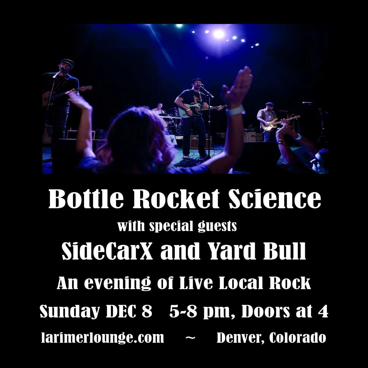 Larimer Lounge Presents Bottle Rocket Science with SideCarX and Yard Bull on Sunday, December 8th - All ages, ticketed guests under 16 admitted with ticketed guardian