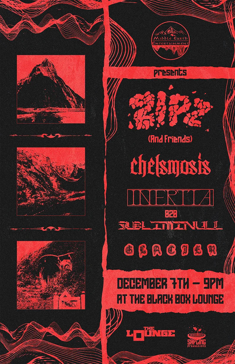 Middle Earth Entertainment: Zipz & Friends w/ Chelsmosis, Inertia B2B Subliminull, Glacier
