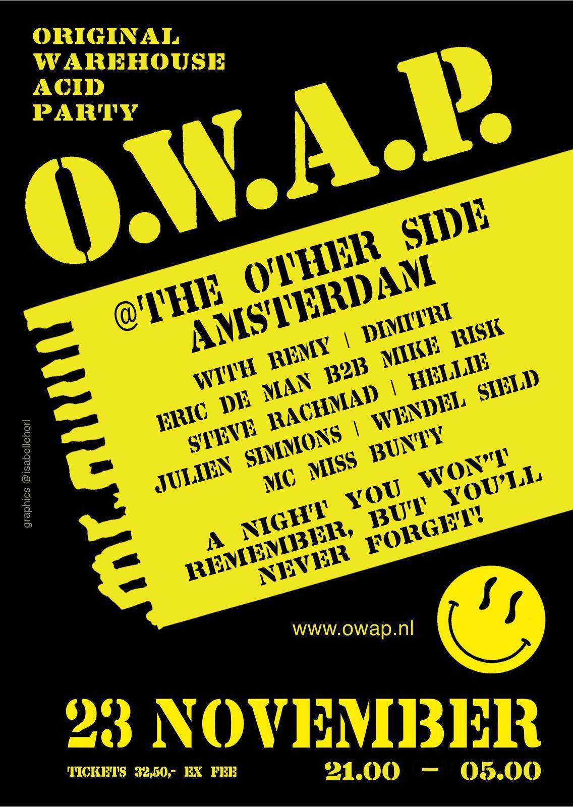 Daar gaan we weer! Op zaterdag 23 November 2024 vindt de volgende O.W.A.P. plaats in The Otherside Amsterdam. Hét ACID feest waar je alle toeters, fluitjes, glowsticks, zweetbandjes en fluor-outfits weer tevoorschijn kan toveren. Een nacht waar je je niks meer van herinnert, maar die ongetwijfeld onvergetelijk is.