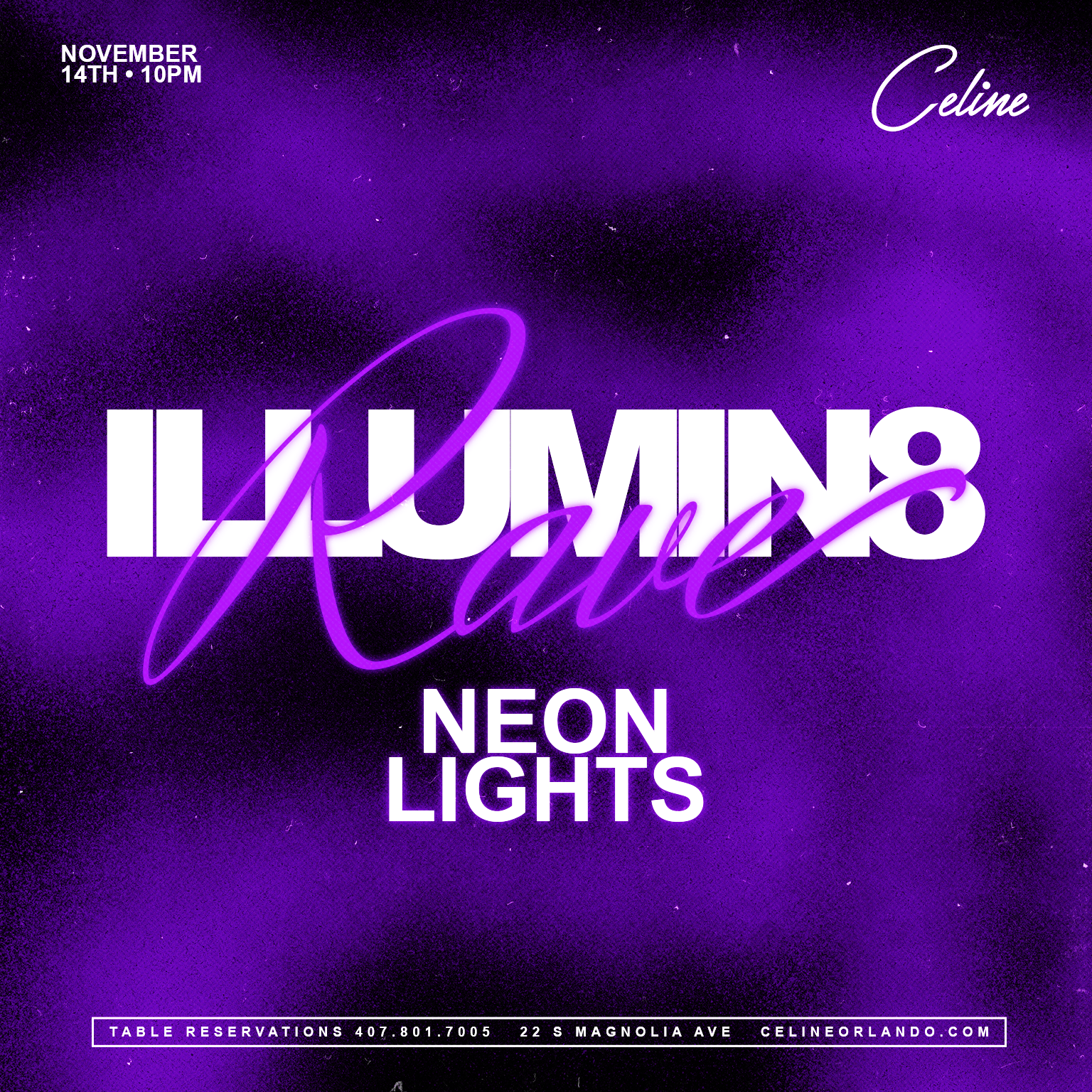 Get ready for your Illumin8 Rave | Thurs 11.14.24! See you on the dance floor! Illumin8 Rave Doors: 10PM | 18+ Special Guest: TBA For More Info: www.celineorlando.com FB: @CelineOrl IG/TW: @Celine_Orlando