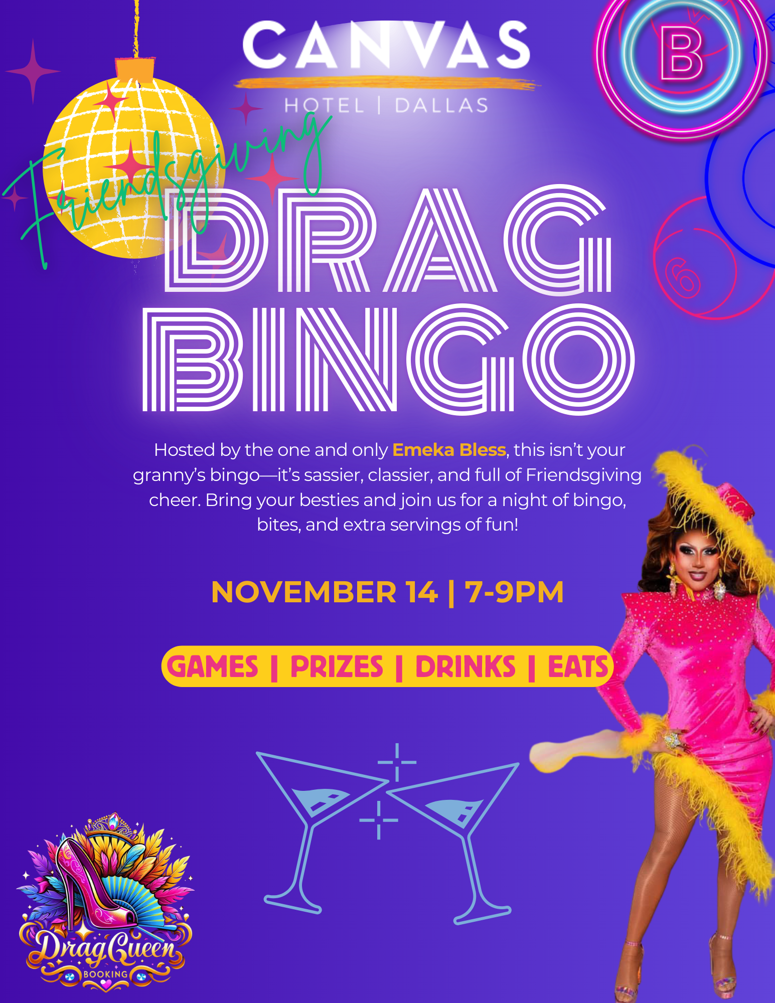 Looking to spice up your Friendsgiving week? We've got just the thing! 🎤 Join us for Friendsgiving Drag Bingo at CANVAS Hotel, hosted by the fabulous Emeka Bless! This isn’t your granny’s bingo—it’s sassier, classier, and filled with wild fun! 🍸✨