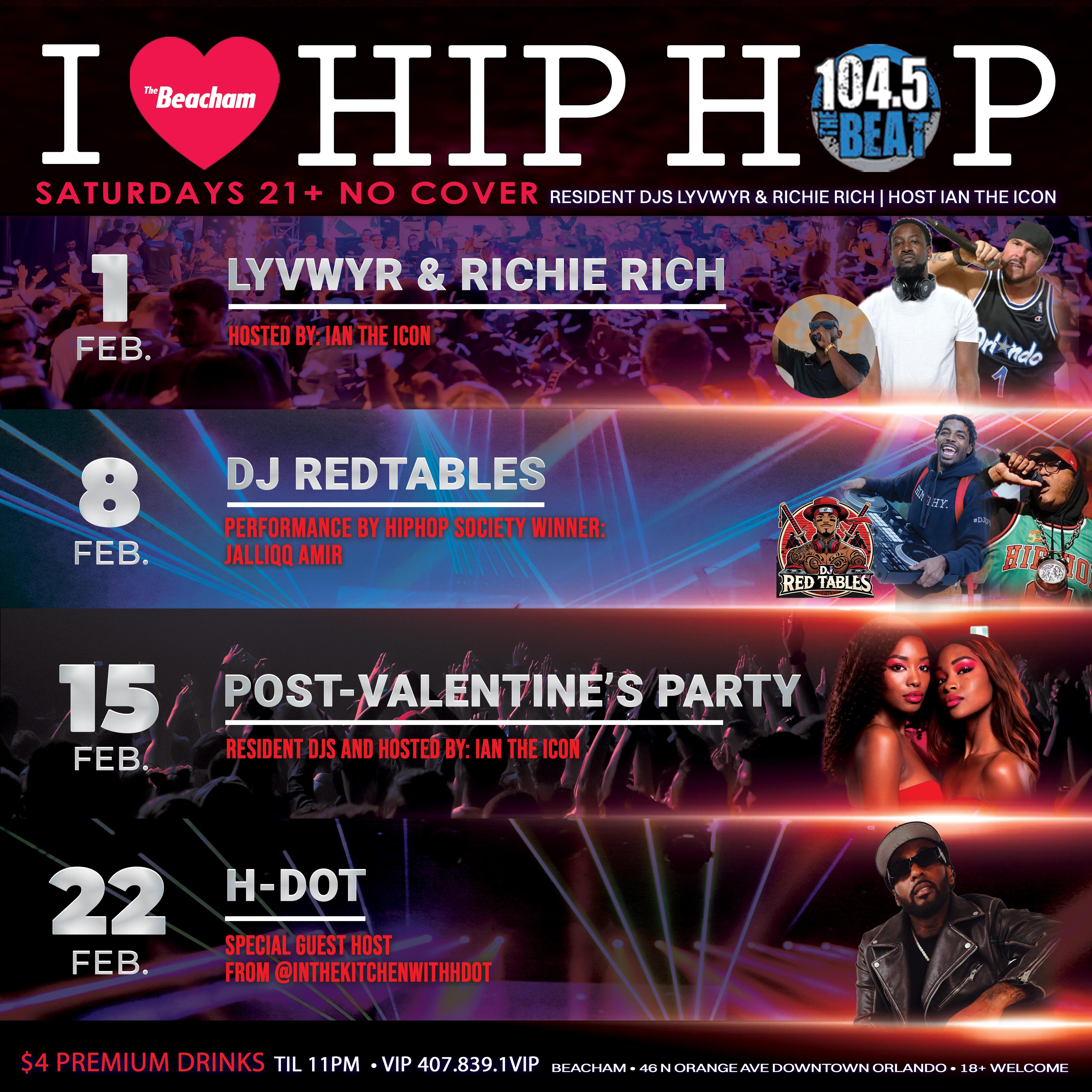 Welcome to I Heart HipHop Saturdays! Join us at The Beacham for a night filled with the best beats and vibes. This weekend we have our Post- Valentines Party. So for everybody who missed Valentines Day, we have you covered. Get ready to dance to your favorite hip-hop tunes all night long. 21+ NO COVER but we do welcome anybody 18+. Our talented DJs will keep the party going until the early hours. Don't miss out on this epic event - grab your crew and hit the dance floor with us this Saturday! Book your VIPs today!