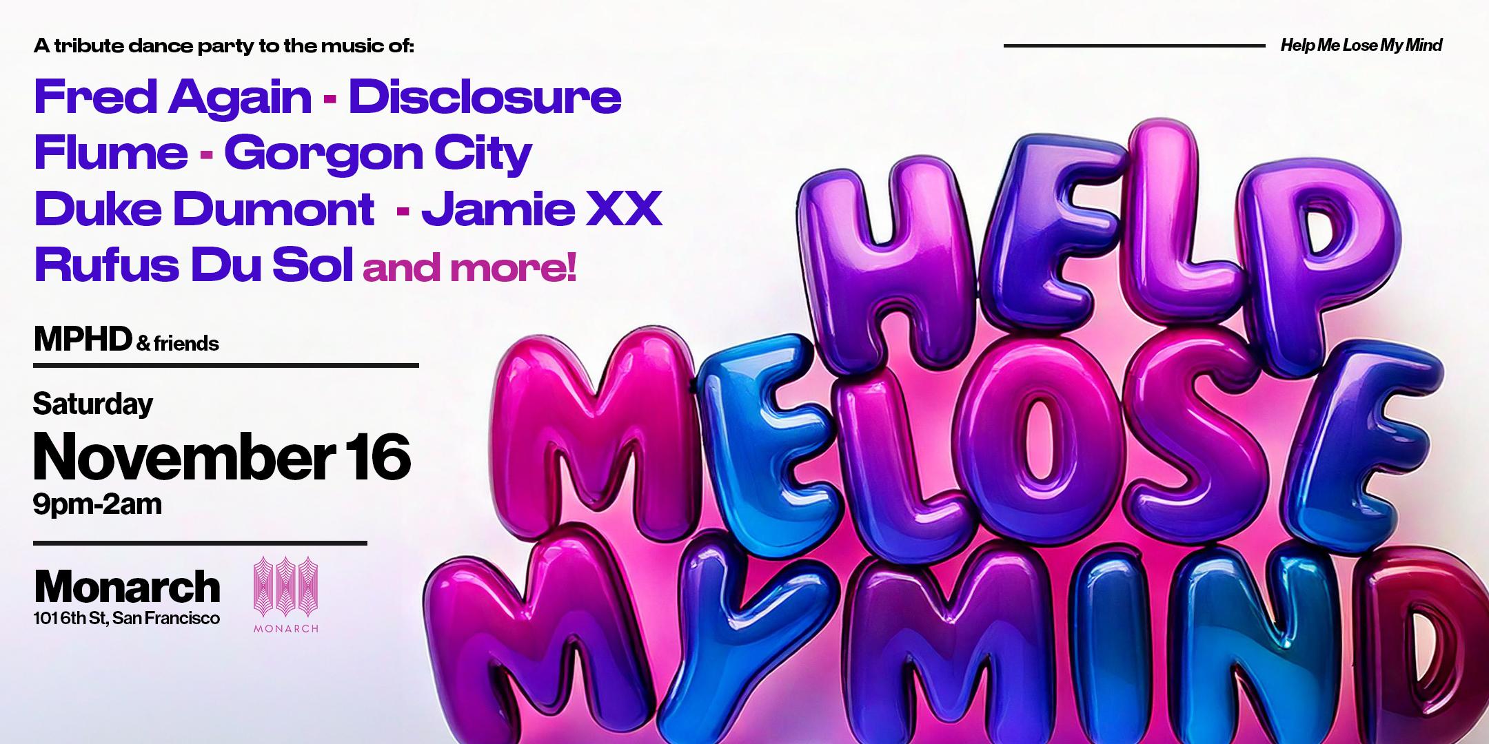Get ready for an extraordinary night of music and celebration at Monarch, the ultimate destination for the San Francisco Tribute dance party HELP ME LOSE MY MIND! on Sat, Nov 16th. WITH DJ MPHD & friends! Prepare to be transported to another realm as we pay homage to the electronic musicians of our time. Join us in honoring the incredible talents of Fred Again, Disclosure, Duke Dumont, Jamie xx, Gorgon City, Rufus Du Sol, and many more