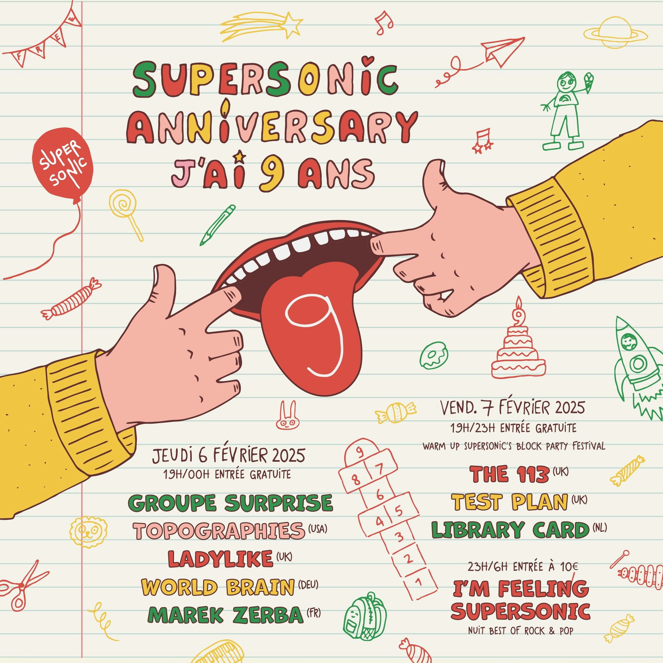 Le jeudi, les copaines Topographies, World Brain, Ladylike, Marek Zerba, et un groupe surprise viendront jouer en ping pong dans nos deux salles Supersonic Club et Supersonic Records.