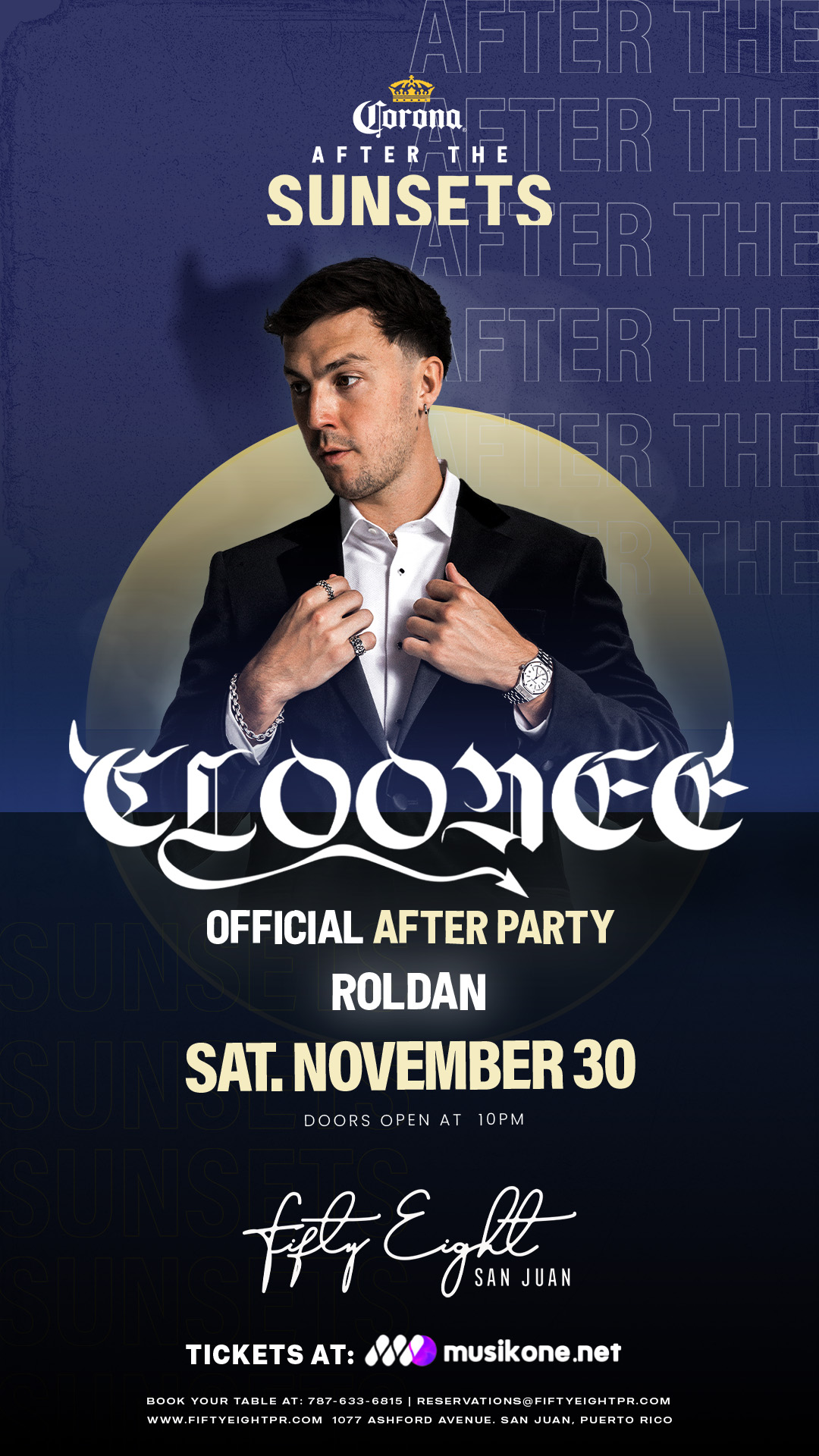CORONA SUNSETS Official After Party International Performance By: C L O O N E E Local grooves: ROLDAN DOORS OPEN AT 10:00 PM LIMITED CAPACITY | GOOD VIBES MANDATORY | WRRA NO SHORTS | NO TANK TOPS | NO SANDALS OR FLIP FLOPS | NO MASKS