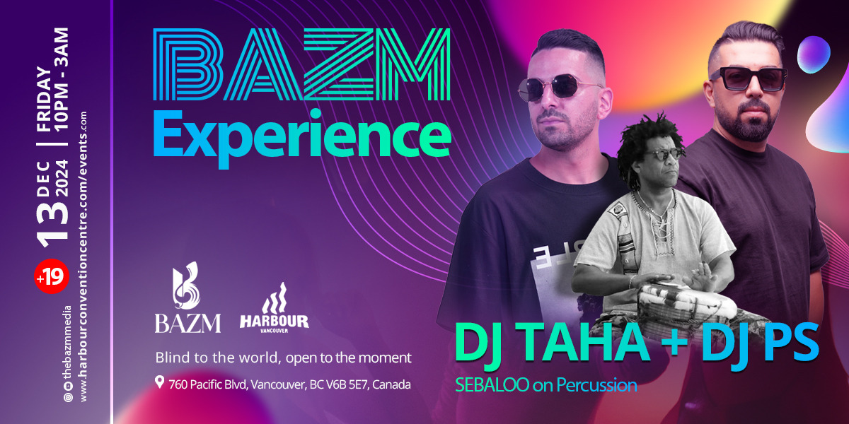 BAZM EXPERIENCE HARBOUR CONVENTION CENTRE 10PM-3AM 19+ Event - Physical ID Required ارائه نسخه فیزیکی کارت شناسایی برای اثبات سن قانونی بالای ۱۹ سال و ورود به سالن اجباریست Join us for an unforgettable night of music, surprises, and pure energy! We're bringing together top-tier DJs, including DJ P.S. and DJ Taha, who will keep you on your feet all night long. But that's not all – we're thrilled to announce a special live performance by the incredible percussionist,SEBALOO, adding a unique flavor to the atmosphere.For all the singles out there, we've prepared an exclusive Blind Date experience designed to help you connect and enjoy the night even more. Expect a vibrant mix of great company, sensational beats, and a festive vibe!With plenty of drinks, non-stop music, dancing, and excitement, this is one event you won't want to miss. Get ready for a night of freedom, fun, and unforgettable memories! See you on the dance floor!