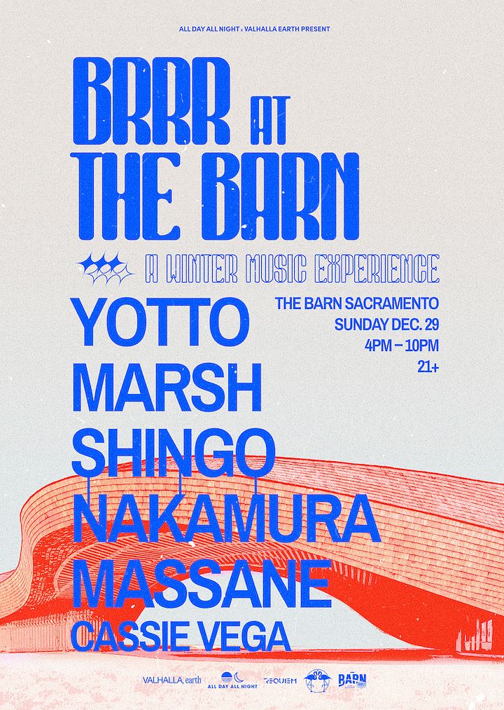 We invite you to the first annual Brrr at The Barn. This star studded lineup includes Yotto, Marsh, Shingo Nakamura, Massane, and Cassie Vega. Let’s end the year together at this special winter music experience at one of the most iconic venues in California!