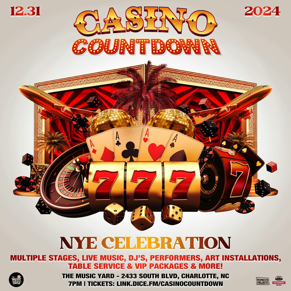 It’s time to end 2024 on a hot streak, announcing CASINO COUNTDOWN NYE Celebration at The Music Yard complex on December 31st! Come get lucky with us at this one-of-a-kind party featuring multiple stages with bands, DJ's, VIP packages & more!! Play your cards right, the stakes are high, the energy is higher, the countdown to midnight is on!