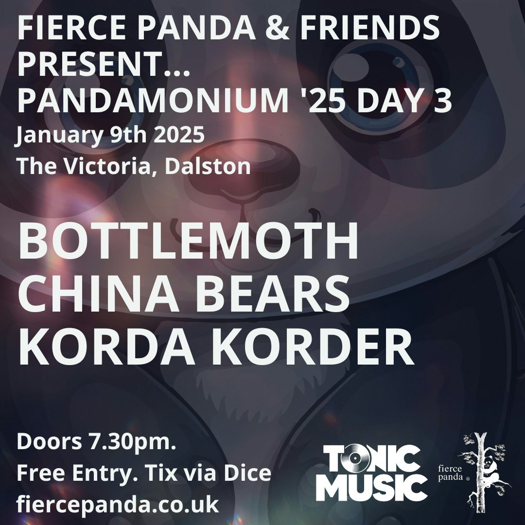 Pandamonium Day 3: Fierce Panda still continue their annual Pandamonium sideshows with a night of gently rambunctious ruminations ahoy: BOTTLEMOTH craft indie-folk music that tugs on the heartstrings with tender vocals, sparkling compositions and captivating lyrics; SUPER FURRY GUESTS womble in from the West Country with emo-esque anthemary; KORDA KORDER come from Brighton and bring the swooning pop wonderment.