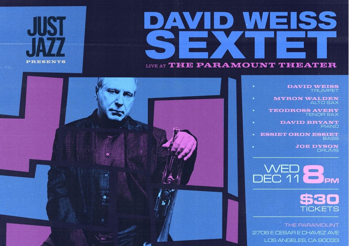 Just Jazz Presents the David Weiss Sextet @ The Paramount LA feat.: David Weiss- Trumpet Myron Walden - Alto Sax Teodross Avery - Tenor Sax, David Bryant- Piano Essiet Okon Essiet- Bass Joe Dyson- Drums. Presented by Just Jazz All ages
