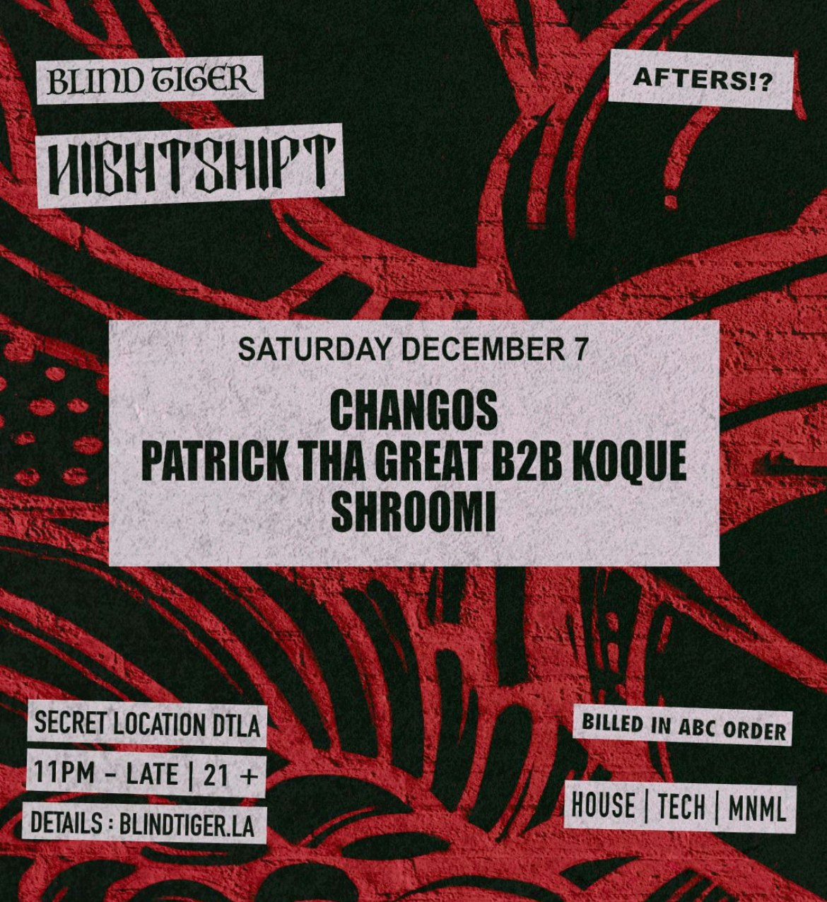 At any of our ‘Nightshift’ events you can expect to hear a strong minimal bass groove, paired with a relentless dark & sexy beat. HOUSE | TECH | MNML ADDRESS SENT WITH PURCHASE CONFIRMATION EMAIL. Presented by Blind Tiger. This is a 21+ event.