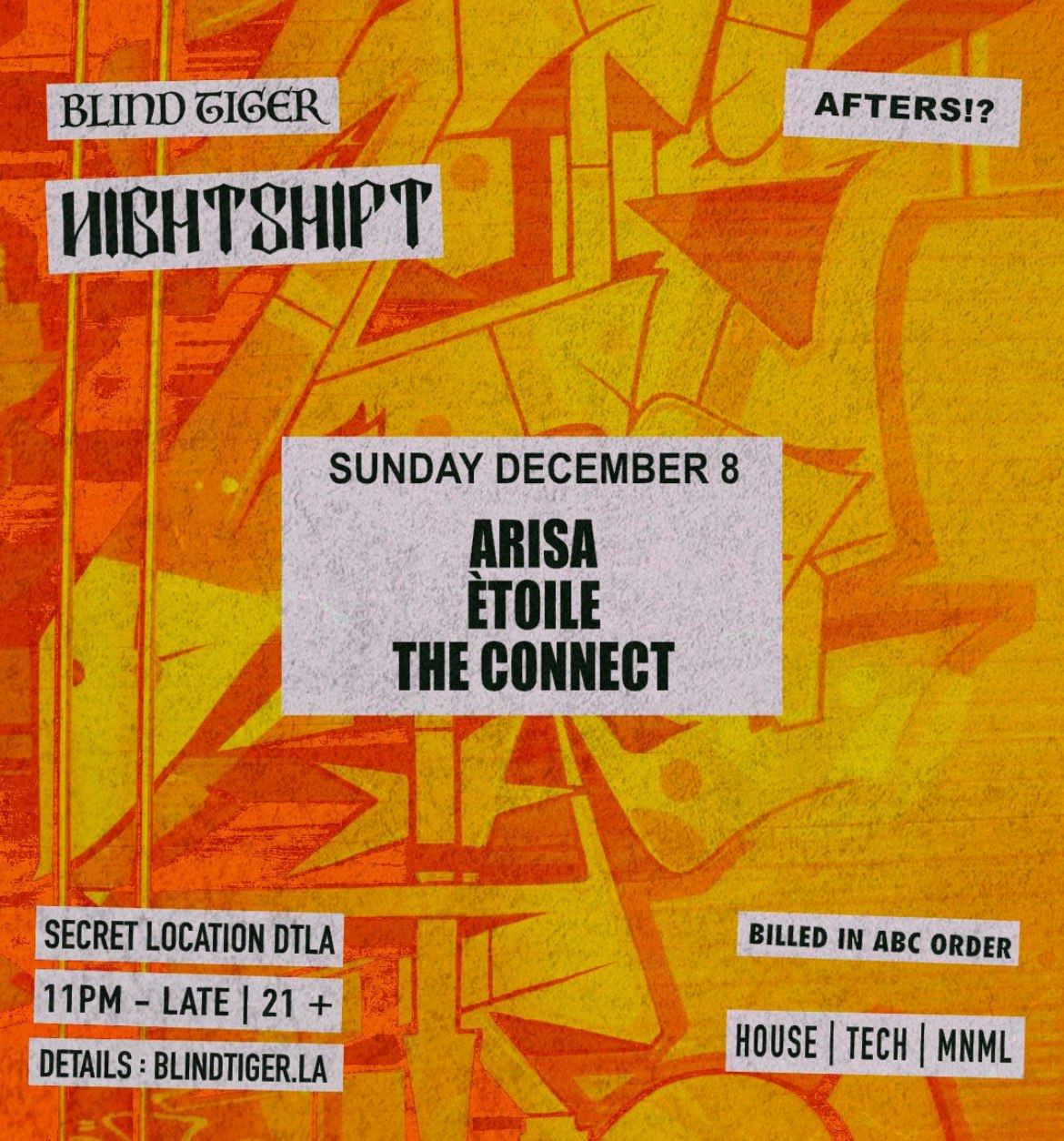 At any of our ‘Nightshift’ events you can expect to hear a strong minimal bass groove, paired with a relentless dark & sexy beat. HOUSE | TECH | MNML ADDRESS SENT WITH PURCHASE CONFIRMATION EMAIL. Presented by Blind Tiger. This is a 21+ event.