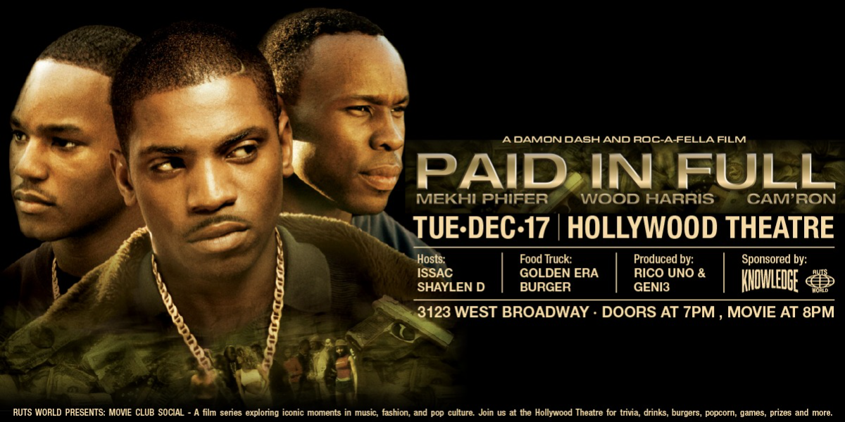 RUTS World Presents MOVIE CLUB SOCIAL A film series exploring iconic moments in music, fashion, and pop culture. Join us at Hollywood Theatre for trivia, drinks, burgers, popcorn, games, prizes and more… Our first feature in the series: PAID IN FULL A Damon Dash and Roc-A-Fella Film Tuesday, Dec 17th Doors: 7pm Paid In Full: 8pm Hosts Isaac Shaylen D Food Truck Golden Era Burger! Produced by Rico Uno & Geni3 In the late 1980s, Ace (Wood Harris) is a young man employed by a Harlem dry cleaning shop, working hard to stay out of the drug business. While making deliveries, he meets Lulu (Esai Morales), a drug dealer who convinces Ace to join him. Ace recruits his friends Mitch (Mekhi Phifer) and Rico (Cam'ron), and the trio become major players in the Harlem drug underworld, a violent business that will test the friends' loyalty and wits as the money rolls in and the dangers grow beyond their control.