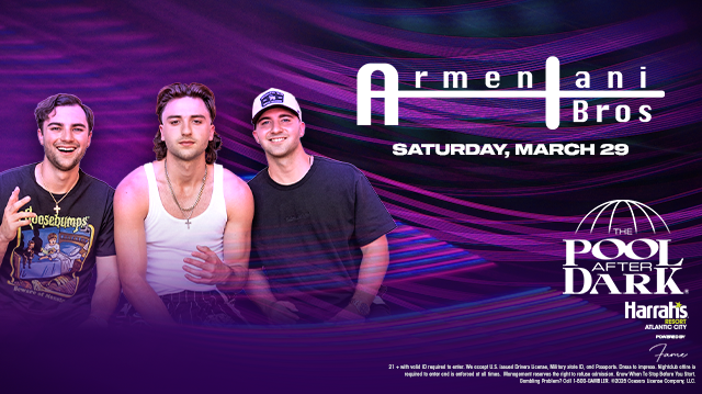 Experience an electrifying Friday night at The Pool After Dark, Harrah's Resort, Atlantic City, featuring the sensational Armentani Brothers. Dive into the heart of Atlantic City's nightlife with an unforgettable DJ set by this dynamic trio of brothers - George, Jimmie, and John Armentani. Hailing from Philadelphia, these brothers have captivated audiences worldwide with their energetic performances and unique sound, earning acclaim from industry giants like Steve Aoki and Kaskade.