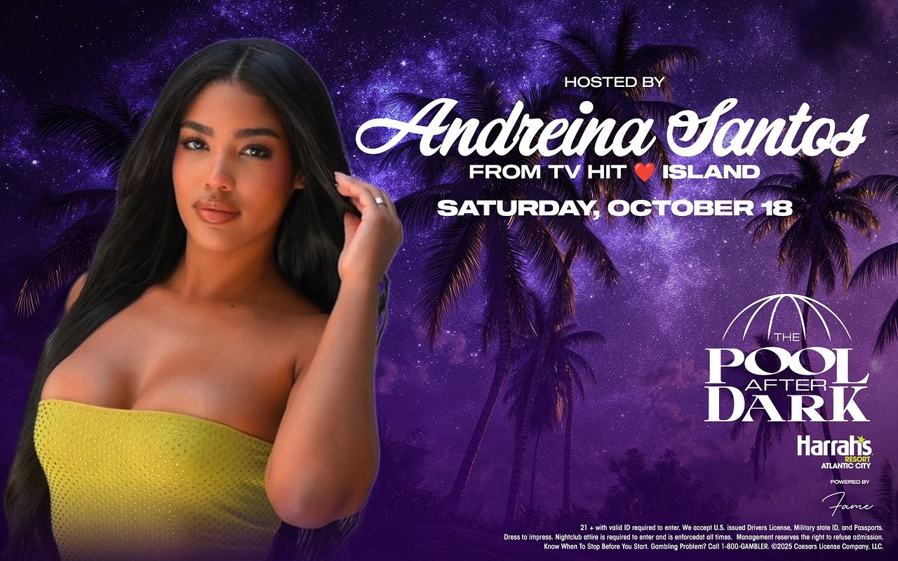 Saturday Night at The Pool After Dark, Harrah's Resort, Atlantic CityDive into the ultimate Atlantic City nightlife experience at The Pool After Dark hosted by ANDREINA SANTOS, located inside Harrah's Resort!