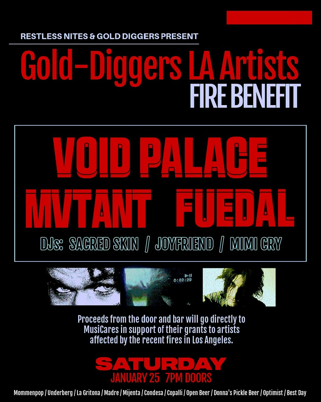 Join us for a very special evening as we raise money for MusiCares grants that go to local musicians affected by the Los Angeles wildfires. The lineup features Void Palace, MVTANT and Fuedal + DJs Sacred Skin, Joyfriend, Mimi Cry.