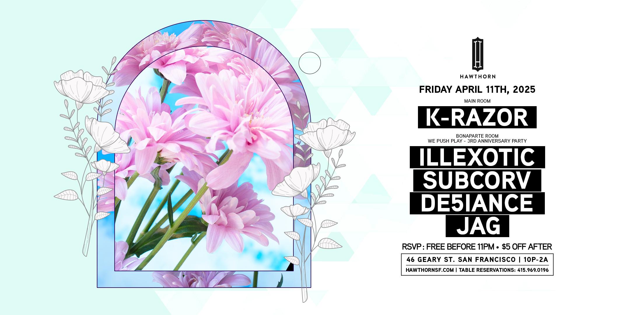 Main Room (Open Format | Hip Hop | Top 40): K-Razor Bonaparte Room (Tech House, Pop Remixes): We Push Play 3 Year Anniversary w/ Illexotic, Subcorv, De5iance, JAG RSVP: Free before 11pm; $5 OFF After