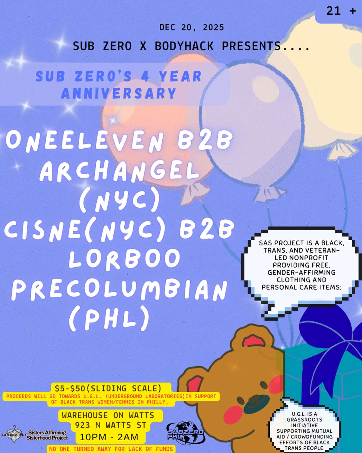 🧊WINTER IS COMING AND SUB ZERO IS HERE TO KEEP YOU WARM🧊 ITS OUR 4 YEAR ANNIVERSARY N WE ARE SO EXCITED TO COLLAB WITH SUCH AN AMAZING ORGANIZATION BASED IN NYC, BODYHACK! Expect to hear some iconic b2bs, ONEELEVEN x ARCHANGEL, CISNE x LORBOO, & AN HOUR SET BY PHILLY’S FAV, PRECOLUMBIAN! SLIDING SCALE TIX $5-50 — THIS EVENT IS A FUNDRAISER FOR UNDERGROUND LABORATORIES WHO’S MISSION IS TO FUND BLACK TRANS FEMMES IN PHILADELPHIA. NO ONE TURNED AWAY FOR LACK OF FUNDS. Come celebrate!