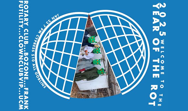 Year of the Rot featuring Rotary Club, Bozone, Frank Futility, ClownClubVIP and Unexplainable Cattle Mutilations2025, Welcome to the Year of the Rot. Join our rag-tag crew of goblin noise-makers to ring in a new old year of signal degradation and system decay.