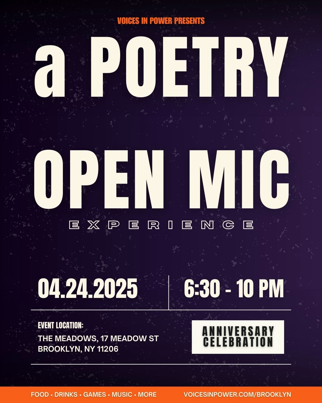 Join us for an unforgettable Poetry Open Mic Experience with Voices In Power in Brooklyn. Thisisn’t your average open mic— this is where poetry meets vibes, & the energy is unmatched.
