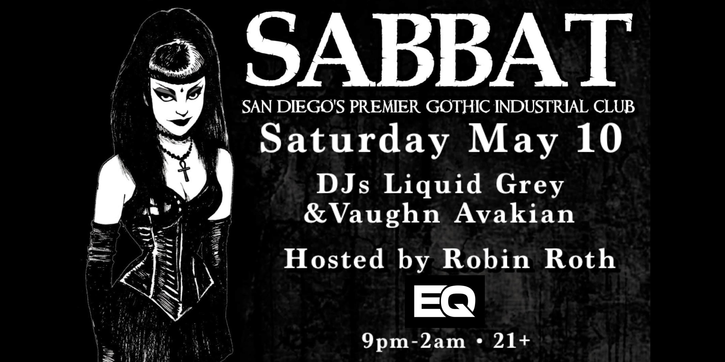 Join us for Club Sabbat on Saturday, May 10, at EQ featuring DJs Liquid Grey & Vaughn Avakian. Hosted by Robin Roth with the Sabbat Go Go Ghouls. 9PM-2AM. 21+. Coat check available.