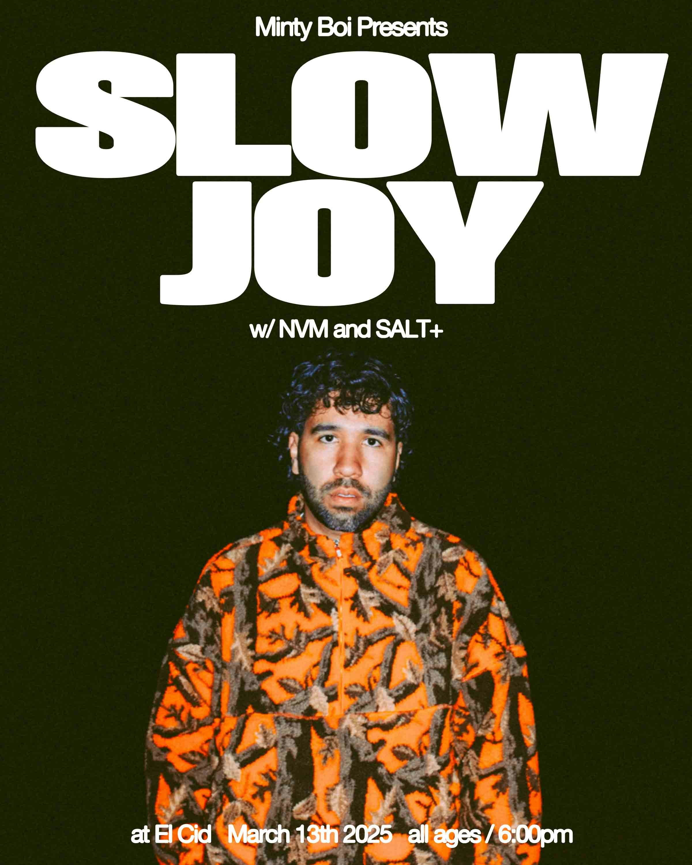 Minty Boi Presents: Slow Joy w/ NVM and Salt+ Live @ El Cid Thursday March, 13th 2025 All Ages / 6pm Presented by Minty Boi. All ages
