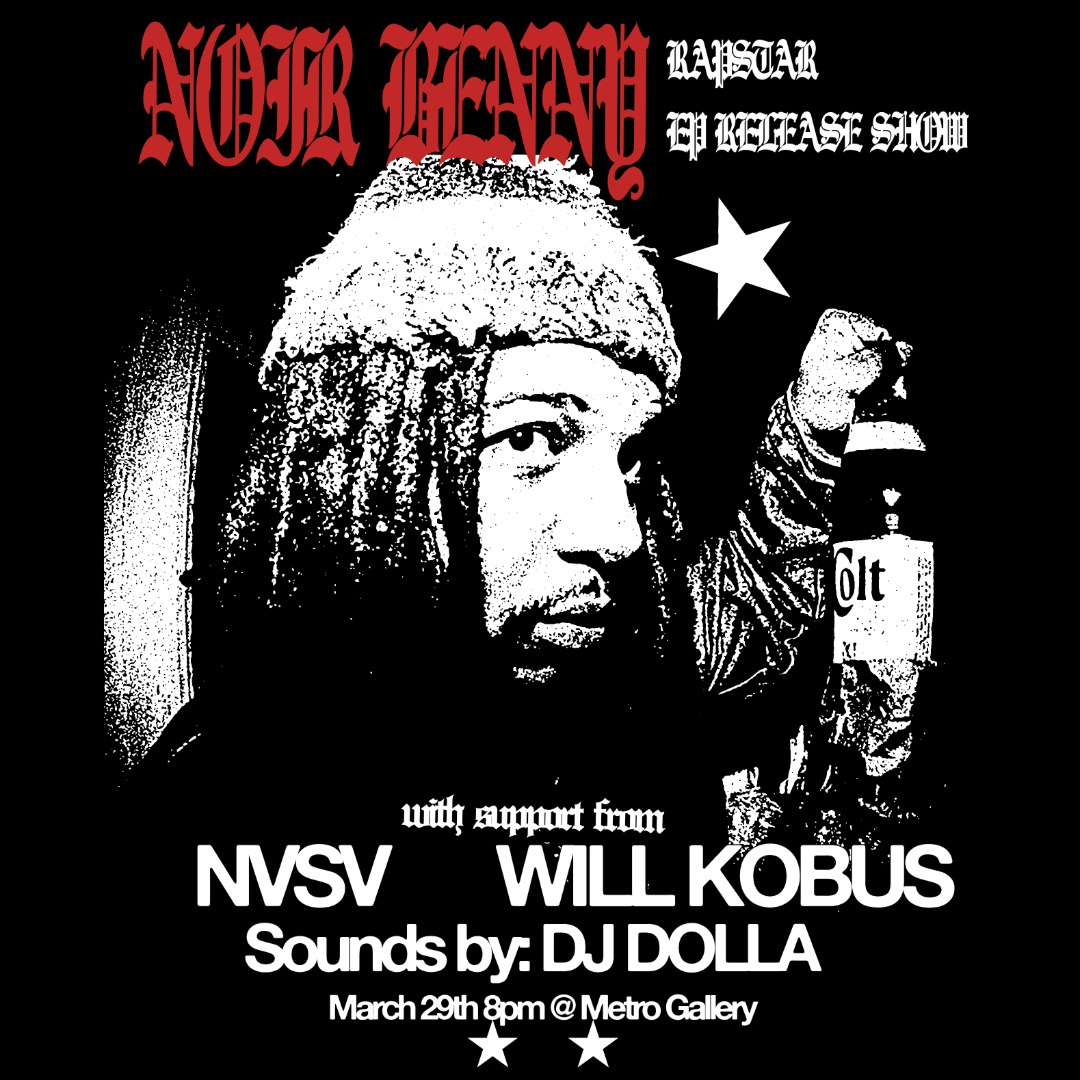 NOIR BENNY 'RAPSTAR' EP Release Show! with NVSV, Will Kobus and DJ Dolla Saturday March 29th 2025 Doors: 8:00 PM // Show: 9:00 PM All Ages Presented by Metro Gallery LLC. All Ages
