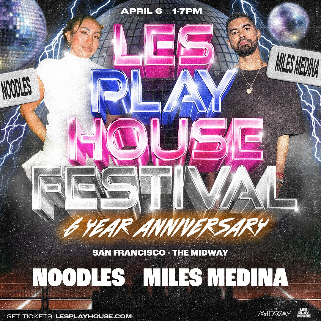 Welcome to the Les Play House 6 Year Anniversary Festival Finale w/ a day party headlined by Noodles + Miles Medina in San Francisco! Bring those dancing shoes to The Midway on Sunday, April 6, 2025 from 1-7PM. Join us for a day of house/disco, good vibes, and unforgettable memories. Don't miss out on this epic event - mark your calendars and spread the word! See you there!