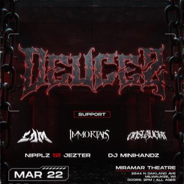 Creating. A. Movement. & The Miramar Theatre Present: DEUCEZ :: DEUCEZ :: [ https://soundcloud.com/deucez_music ] :: C.A.M. :: [ https://soundcloud.com/cameron-butler-1 ] :: Immortals Collective :: [ https://soundcloud.com/immortals_collective ] :: Onslaught :: [ https://soundcloud.com/onslaughtdubstep ] :: Nipplz b2b Jezter :: [ https://soundcloud.com/user-456584693 https://soundcloud.com/jezterdubz ] :: DJ Minihandz :: All Ages Show || Doors 9pm 2844 N. Oakland Ave. Milwaukee, WI 53211