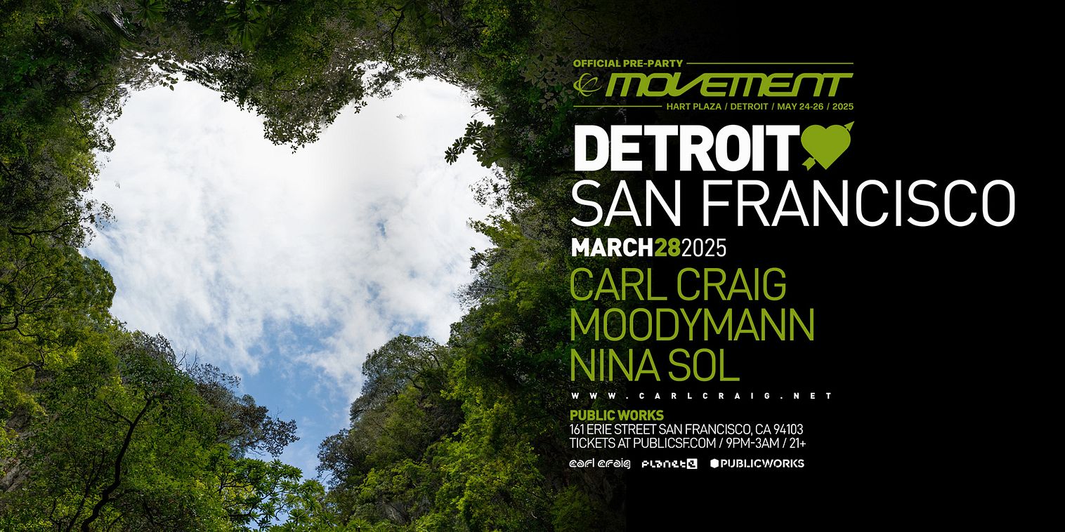 Friday, March 28th, 9pm - 3am Full Space / 21+ / Limited Capacity In addition to online presales, tickets will also be available at the door night of. DETROIT LOVE RETURNS WITH LEGENDS MOODYMANN & CARL CRAIG Support by Nina Sol