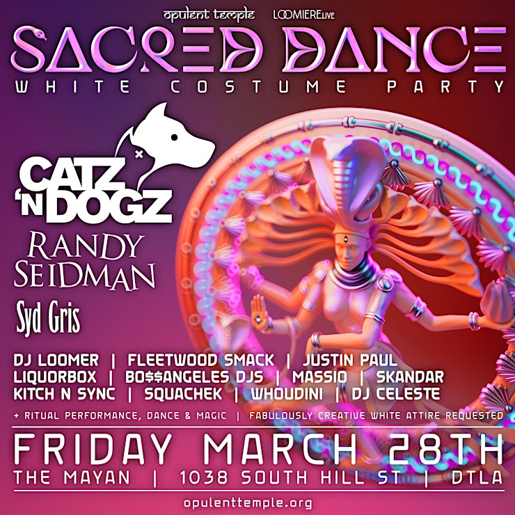 Opulent Temple in L.A. and Loomiere.live Present: Sacred Dance 2025 “white costume party” at The Mayan SAVE THE DATE: Friday, March 28, 2025 The 14th Annual Sacred Dance “White Party” LA returns to The Mayan in Downtown LA. With 3 rooms of music, deco, dancers and our beautiful Sacred Dance vibe.
