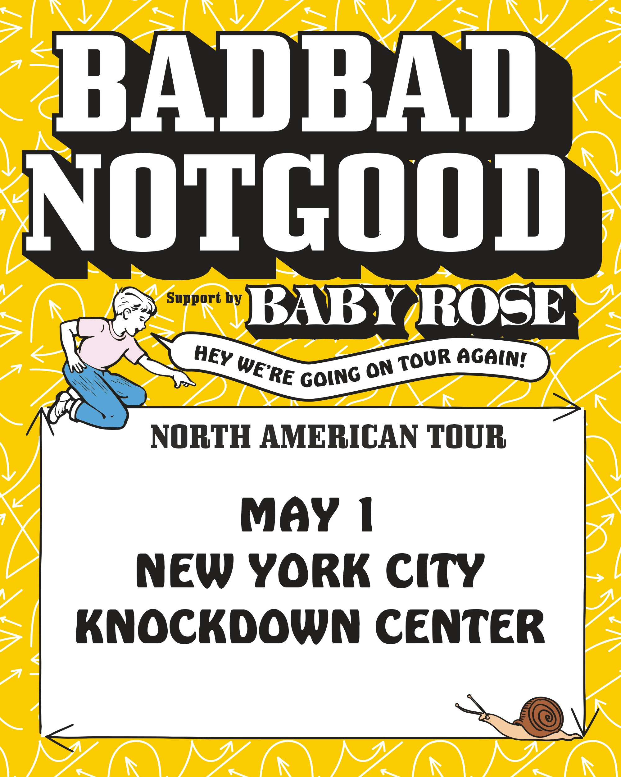 This spring, BADBADNOTGOOD will be bringing their genre defying album, Mid Spiral suite: Chaos, Order and Growth, on the road, featuring a special performance with Baby Rose, of their joint EP, Slow Burn. The trio called on some of their closest friends and collaborators, BADBADNOTGOOD touring member Felix Fox-Pappas (keys) and a few key-players in the Toronto jazz scene including Kaelin Murphy (trumpet), Juan Carlos Medrano Magallenes (percussion) and LA musician Tyler Lott (guitar), for an intensive and productive one-week of recording at Valentine Studios in Los Angeles in February 2024. The result is the Mid Spiral suite: Chaos, Order and Growth, which will be performed along with live reinterpretations of their previous releases.