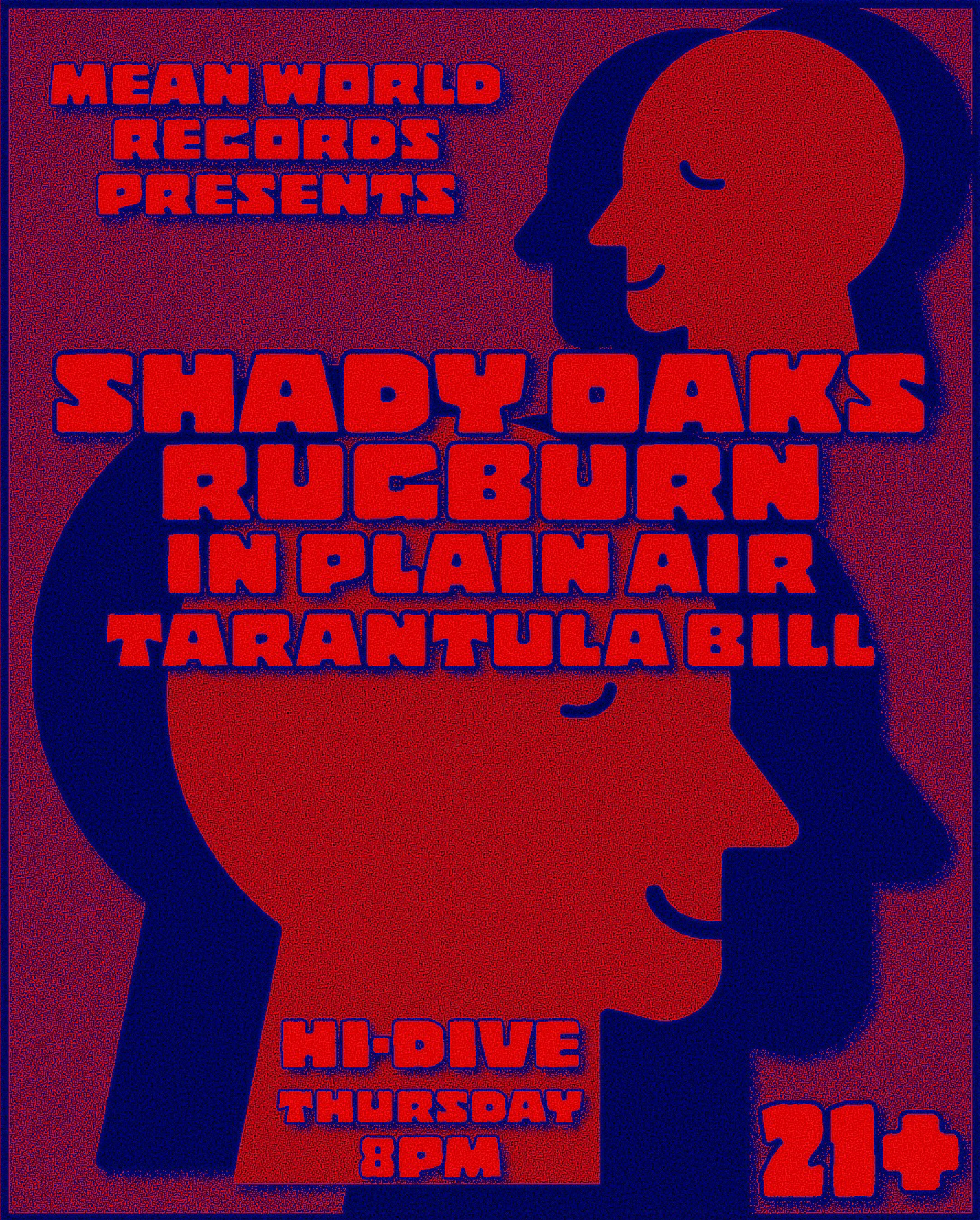 Mean World Records Presents: SHADY OAKS + RUGBURN + IN PLAIN AIR + TARANTULA BILL (Doors 7pm/Show 8pm) Presented by Hi-Dive. This is a 21+ event