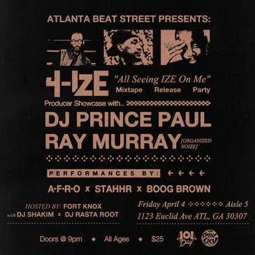 Atlanta Beat Street and Speakeasy present… 4-IZE, DJ Prince Paul, Ray Murray, A-F-R-O, Boog Brown, Stahhr, DJ Shakim, DJ Rasta Root, Hosted by Fort Knox 9pm / All Ages / $25+ Tickets: https://seetickets.us/4izea5