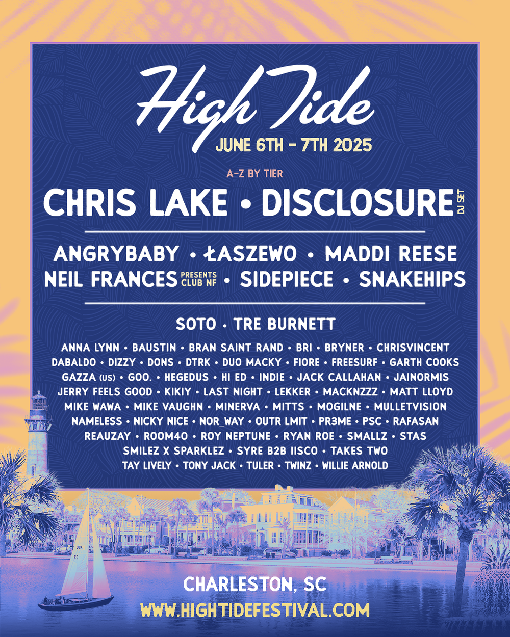 (21+) High Tide is back—and now bigger than ever! Join us for two unforgettable days, Friday, June 6th, and Saturday, June 7th, as we kick off summer proper! Experience Charleston’s best House Music festival with 2 stages of dance music, an extraordinary culinary program, incredible shopping, and a weekend packed with good vibes and exciting events. You don’t want to miss this! (Friday: Chris Lake, Sidepiece, Snakehips, Maddi Reese, Soto, + more) (Saturday: Disclosure DJ Set, Neil Frances Presents ClubNF, Łaszewo, Angrybaby, Tre Burnett, + more)