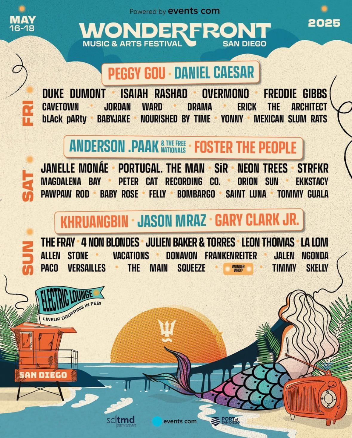 The Wonderfront Music & Arts Festival, May 16-18, 2025 is a three-day event at San Diego’s picturesque waterfront, featuring top artists like Anderson .Paak & The Free Nationals, Peggy Gou, Daniel Caesar, Jason Mraz, Khruangbin, Gary Clark Jr., and more. Set in iconic venues like Embarcadero Marina Park North, Seaport Village, and Ruocco Park, the festival offers stunning harbor views. Attendees can enjoy yacht parties, interactive art installations, and a curated selection of local food and drinks. Just steps from the lively Gaslamp Quarter and Little Italy, Wonderfront blends music, culture, and community for an unforgettable experience.