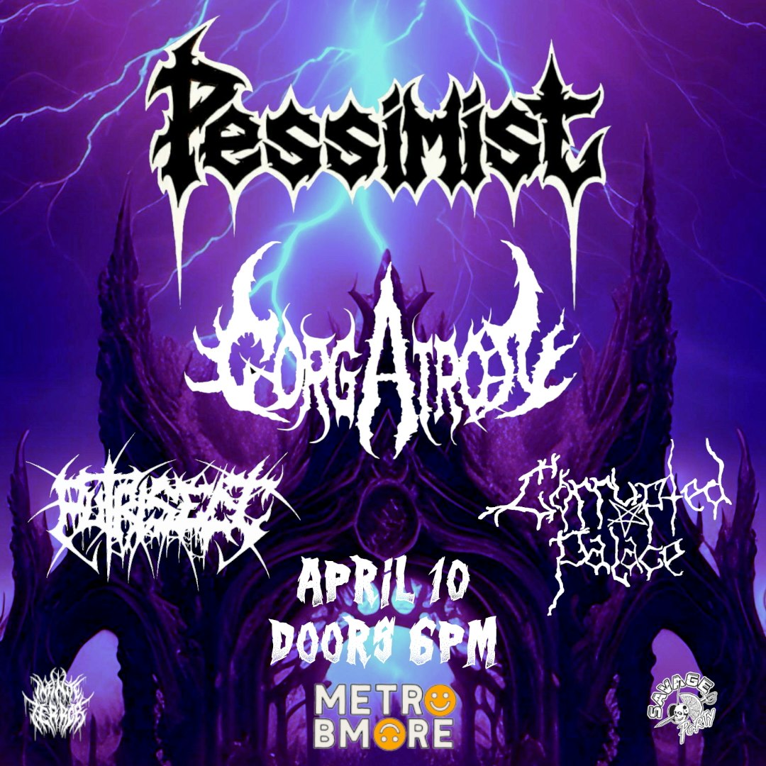 Infinite Terror x Savage Party Presents PESSIMIST with Gorgatron, Putrisect and Corrupted Palace Thu. Apr. 10th 2025 Doors: 6:00 PM // Show: 7:00 PM All Ages Infinite Terror x Savage Party Presents All Ages