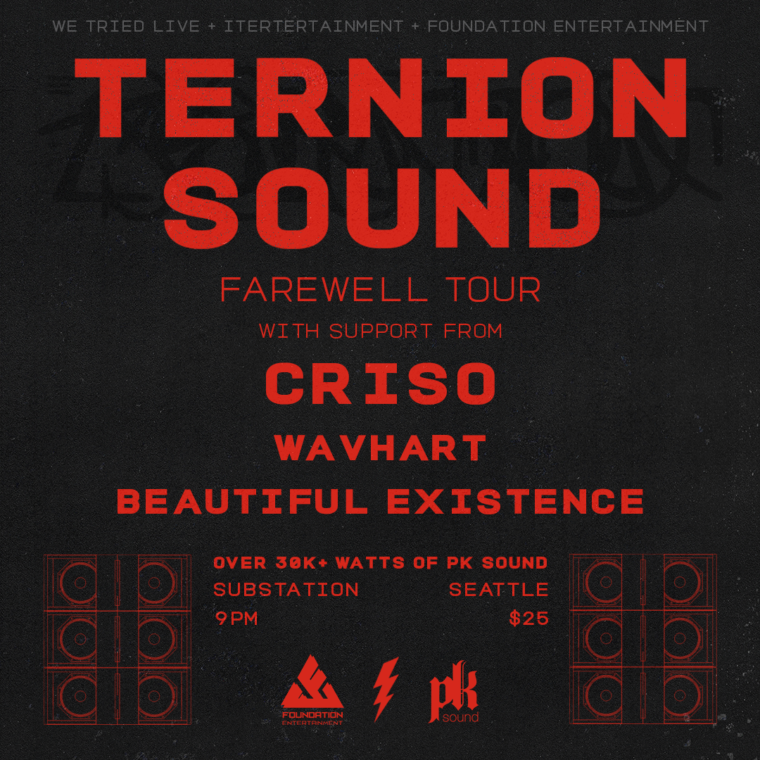 We Tried x Itertainment x Foundation present: Ternion Sound "Farewell Tour" with Special Guest: Criso support from: WAVHART & Beautiful Existence at Substation Seattle. 21+ only