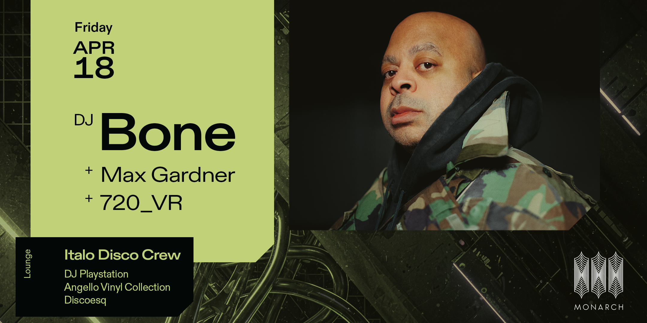 Detroit's own DJ Bone brings his uncompromising underground sound to Monarch on April 18th—backed by Max Gardner and 720_VR.