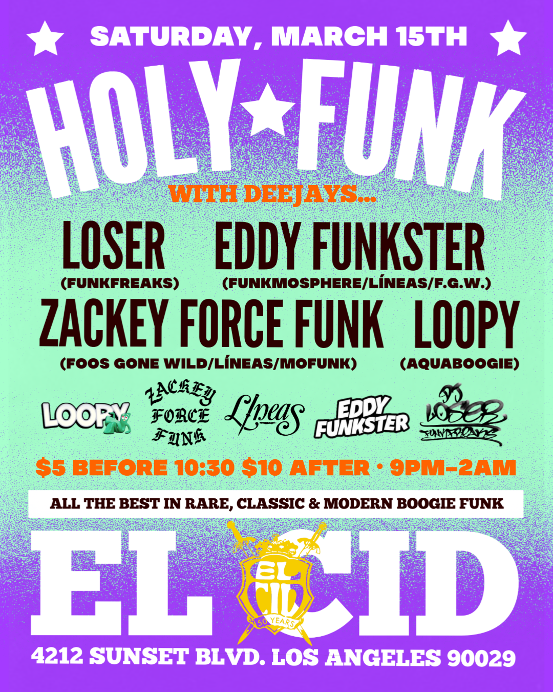 Saturday March 15th HOLY FUNK is bringing you a Boogie Funk party sized for the city with DJs Loser, Zackey Force Funk, Eddy Funkster & Loopy of crews/labels Funk Freaks Records, Foos Gone Wild, Funkmosphere, Líneas, Mofunk, Aquaboogie... Spinning Rare, Classic & Modern Boogie Funk. Cuts that will make you say Holy Funk! And have you on the dancefloor all night long. Record & Vintage Memorabilia vendors posted on the patio every time.