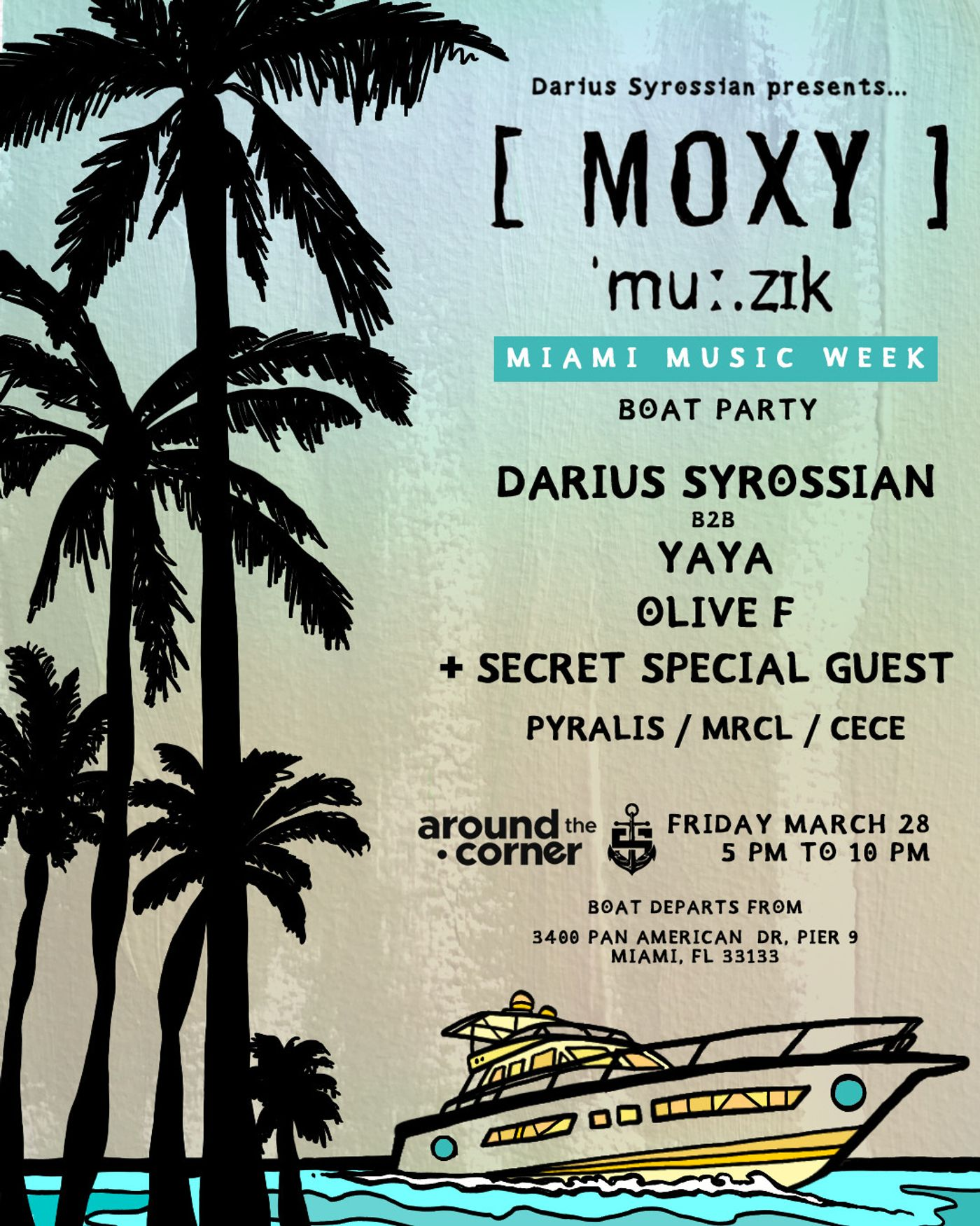Around The Corner BOAT PARTY (Coconut Groove) 3400 Pan American Dr Pier 9, Miami, FL 33133, EE. UU. Remember: Boat Sails March 28 from 5 PM to 10 PM Boat Address : 3400 pan american drive, pier 9 miami fl 33133