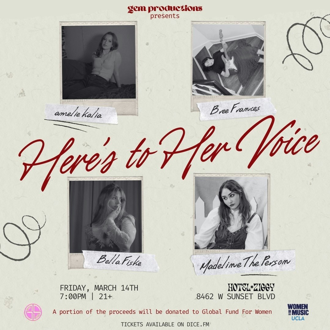 “Here's to Her Voice”, presented by GEM Productions, is a showcase celebrating women in music, featuring rising female musicians Amelie Kalia, Bree Frances, Bella Fiske, and Madeline The Person. Founded by Grace Masura, GEM Productions is dedicated to empowering aspiring female industry professionals, creatives, and artists. Held during Women’s History Month at Hotel Ziggy, the event not only spotlights emerging talent but also supports a meaningful cause, with a portion of the proceeds benefiting the Global Fund for Women.